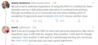 Then we have nationalist supporters who think their own personal experience is all the evidence one needs to evaluate how well the SNP NHS is performing. This one was the chairman of a cancer charity which makes his comments even more abhorrent.